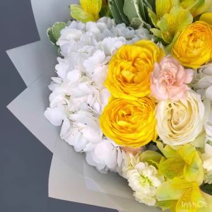 Авторский букет из белой Гортензии и желтых пионовидных Роз