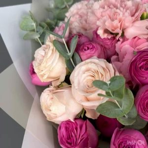Авторский букет из розовых Гортензий и кустовых пионовидны Роз