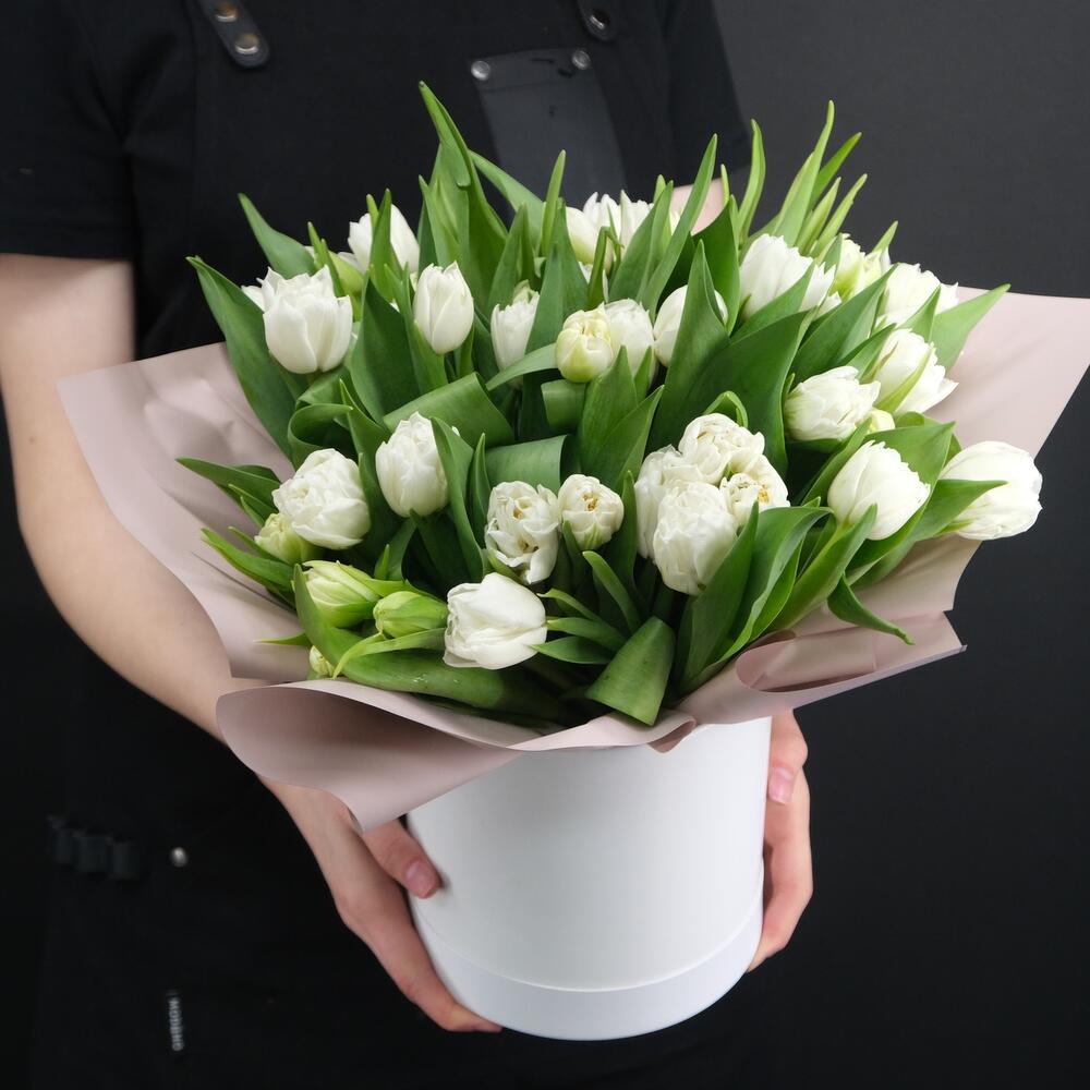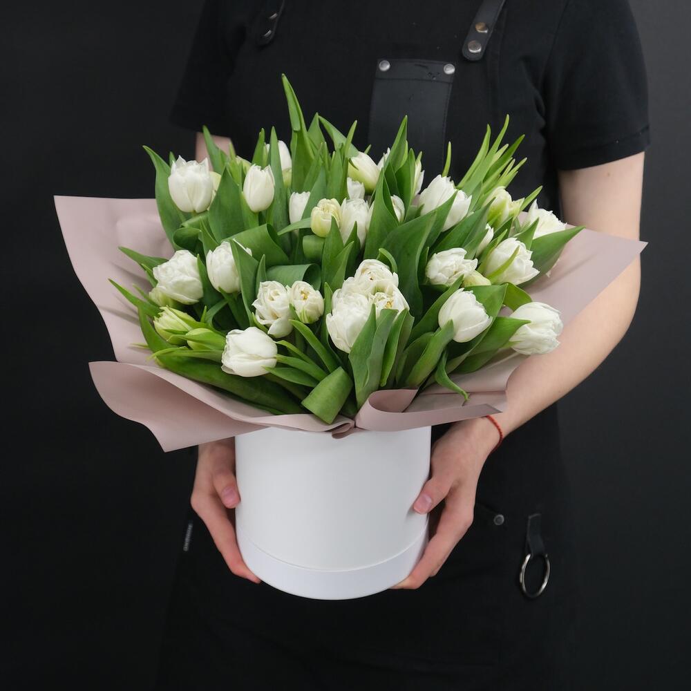 31 белый пионовидный тюльпан в шляпной коробке в Великих Луках